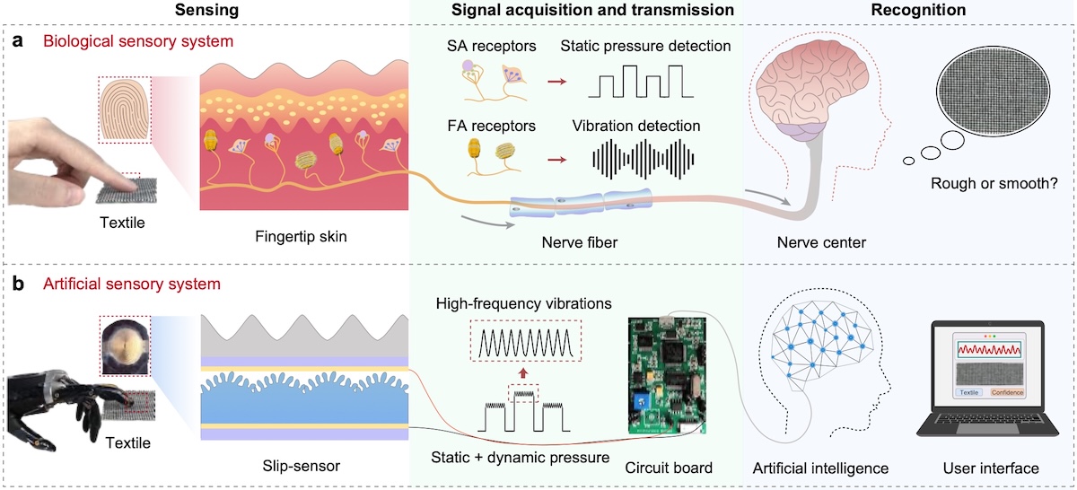 Humans can gently slide a finger on the surface of an object and identify it by capturing both static pressure and high-frequency vibrations. Although modern robots integrated with flexible sensors can precisely detect pressure, shear force, and strain, they still perform insufficiently or require multi-sensors to respond to both static and high-frequency physical stimuli during the interaction. Here, we report a real-time artificial sensory system for high-accuracy texture recognition based on a single iontronic slip-sensor, and propose a criterion—spatiotemporal resolution, to corelate the sensing performance with recognition capability. The sensor can respond to both static and dynamic stimuli (0-400Hz) with a high spatial resolution of 15μm in spacing and 6μm in height, together with a high-frequency resolution of 0.02Hz at 400Hz, enabling high-precision discrimination of fine surface features. The sensory system integrated on a prosthetic fingertip can identify 20 different commercial textiles with a 100.0% accuracy at a fixed sliding rate and a 98.9% accuracy at random sliding rates. The sensory system is expected to help achieve subtle tactile sensation for robotics and prosthetics, and further be applied to haptic-based virtual reality and beyond.