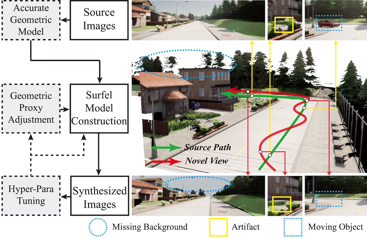 Novel view image synthesis for outdoor scenes has been challenged by inaccurate depth measurements, moving objects, and wide-angle rendering. In this paper, we propose an adaptive novel view image synthesis pipeline to generate realistic images of large-scale traffic scenes. The novelty of this work is threefold: 1) developing a set of high-fidelity 3D surfel model reconstruction methods with depth refinement and moving object removal schemes; 2) developing a self-adaptive rendering scheme adapted to different novel views via surfel geometry adjustment; 3) developing a hyper-parameter tuning scheme based on image quality evaluation to achieve better surfel model construction and adaptation. The removed back- grounds and other occluded regions within 3D scene geometric models are further inpainted using a Generative Adversarial Network (GAN). The KITTI dataset and CARLA simulator are used to verify the proposed novel view image synthesis pipeline. Experiment results show that our method outperforms other approaches for large-scale traffic scene image synthesis in terms of computational efficiency and the quality of synthesized images.